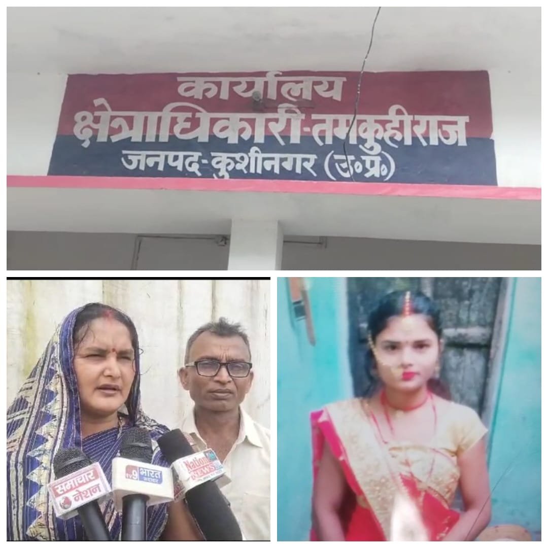 अहमद हुसैन , प्रदेश संवाददाता (उप्र) : कुशीनगर। जनपद के तमकुहीराज तहसील क्षेत्र अंतर्गत एक विवाहित युवती के दहेज के लिए प्रताड़ित कर ससुराल वालों द्वारा जान से मार देने का मामला प्रकाश में आया है। गिरफ्तारी व शव बरामदगी को लेकर मृतका जुही देवी के परिजनों ने पुलिस क्षेत्राधिकारी तमकुही राज जितेंद्र सिंह कालरा को प्रार्थना पत्र सौंप न्याय की गुहार लगायी है।