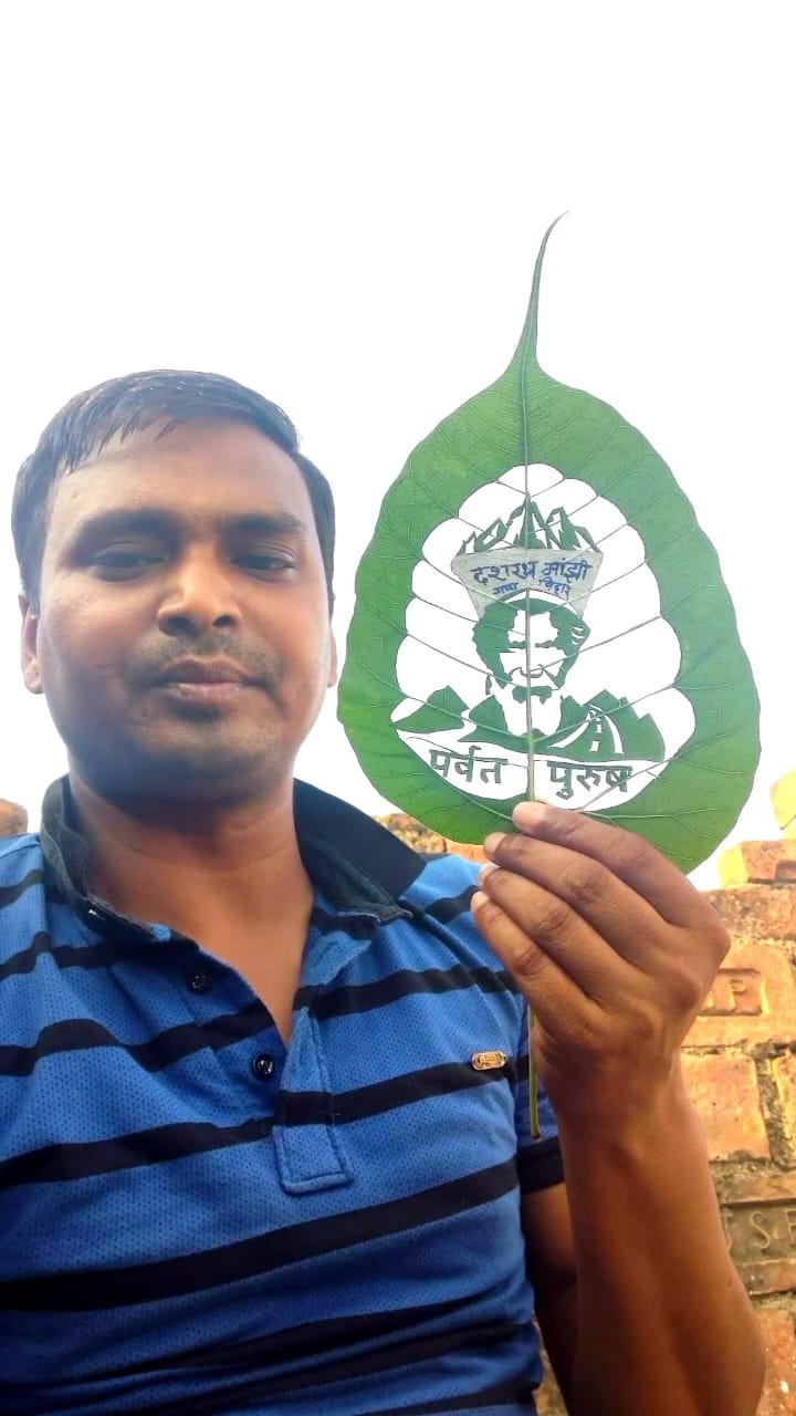 इधर बिहार के अंतर्राष्ट्रीय सैंड आर्टिस्ट मधुरेंद्र कुमार ने एक बार फिर से अपनी कलाकृति से बेमिसाल अंदाज में पर्वत पुरुष दशरथ मांझी को श्रद्धांजलि दी है। सैंड आर्टिस्ट मधुरेंद्र ने शनिवार को अपनी 5 घंटों के कठीन मेहनत के बाद दुनियां के सबसे छोटी 5 सेमी. वाली पीपल के हरे पत्तों पर अपनी कलाकृति में पर्वत पुरुष दशरथ मांझी के जीवन संघर्ष का दास्तां उकेर हैं और अपनी कलाकृति के माध्यम से उन्हें भावपूर्ण याद करते इनकी संघर्ष का सन्देश दिया हैं।