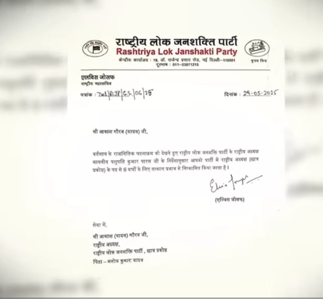 आकाश यादव राष्ट्रीय लोक जनशक्ति पार्टी के छात्र प्रकोष्ठ के राष्ट्रीय अध्यक्ष थे। लेकिन आज पार्टी ने उन्हें 6 साल के लिए निष्कासित कर दिया है। आरएलजेपी के राष्ट्रीय अध्यक्ष और पूर्व केंद्रीय मंत्री पशुपति कुमार पारस के आदेश पर पार्टी में यह फैसला लिया है।
