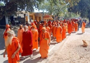 पंचकोशी यात्रा के दौरान ग्रामीणों ने नागा साधुओं का पुष्प वर्षा कर किया भव्य स्वागत।
