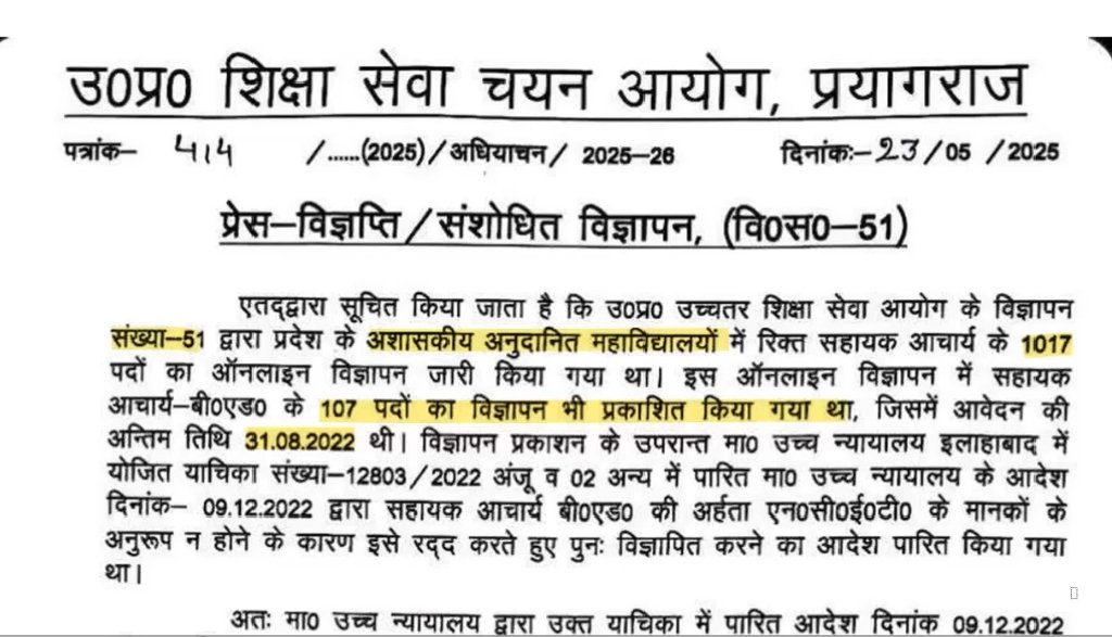 उत्तर प्रदेश शिक्षा सेवा चयन आयोग, प्रयागराज की ओर से सहायक आचार्य b.ed के रिक्त पदों पर भर्ती निकाली गई है।