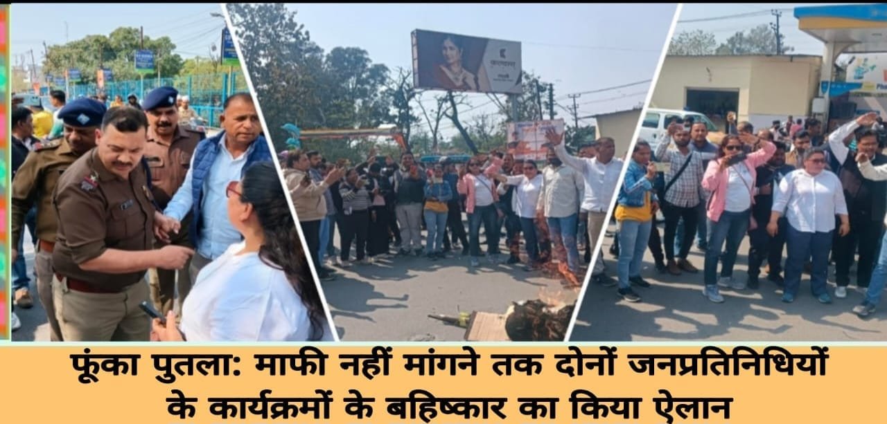 पत्रकारों का अपमान करने के विरोध में मंगलवार को विधायक प्रदीप बत्रा और मेयर अनीता अग्रवाल के ख़िलाफ़ नारेबाजी कर पत्रकारों द्वारा उनका पुतला फूंका गया। इसी के साथ यह तय किया गया है कि दोनों जनप्रतिनिधियों के द्वारा माफ़ी ना मांगने तक सभी पत्रकार विरोध स्वरूप काली पट्टी बांधकर काम करेंगे। वही मुख्यमंत्री के सामने मामला रखने जा रहे पत्रकारों को पुलिस और प्रशासन के अधिकारियों ने रोक लिया।